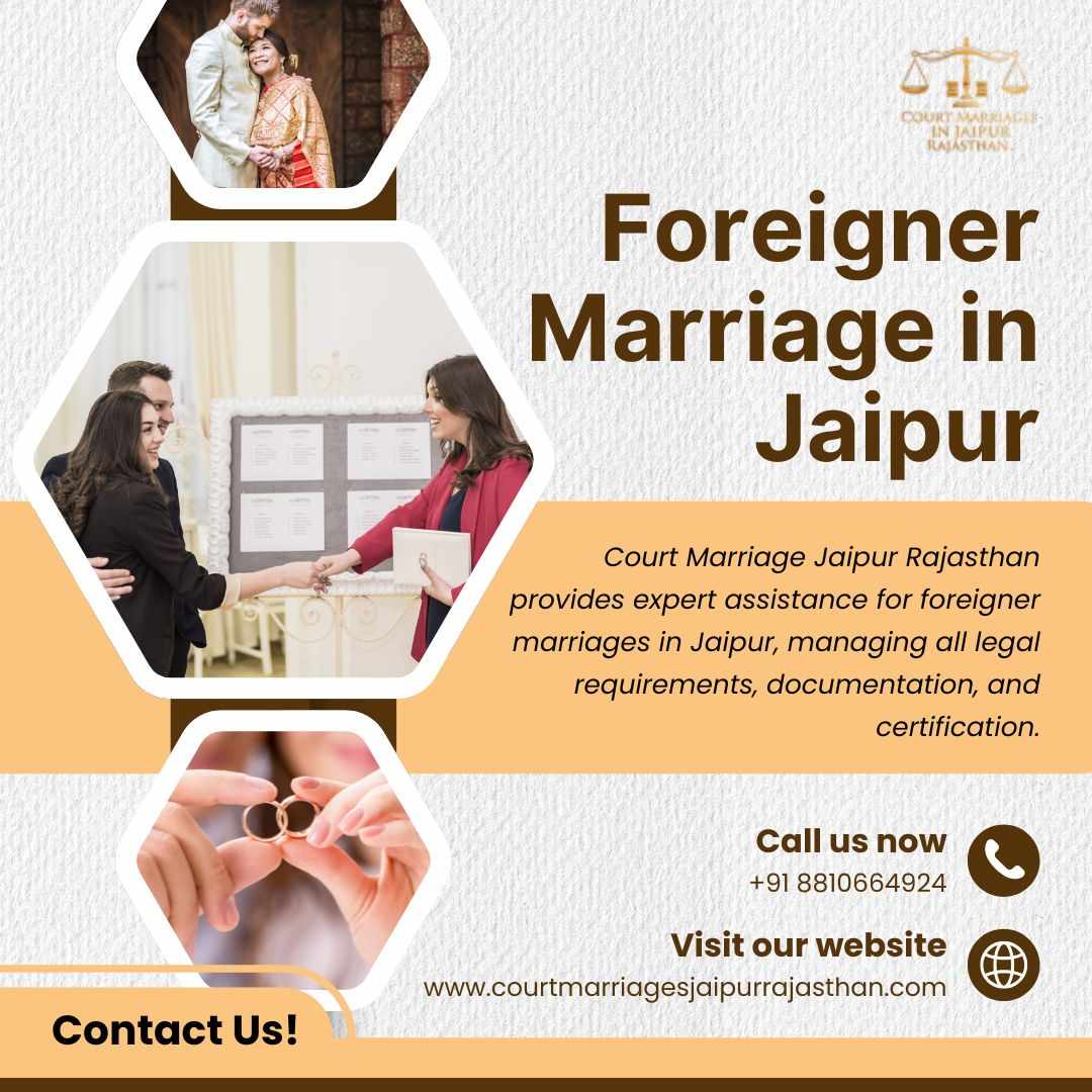 Court Marriage Jaipur Rajasthan provides expert assistance for foreigner marriages in Jaipur, managing all legal requirements, documentation, and certification. We help international couples navigate Indian marriage laws seamlessly, offering transparent pricing and reliable support. Our experienced legal team ensures a smooth and lawful marriage process so foreign couples can register their marriage hassle-free.